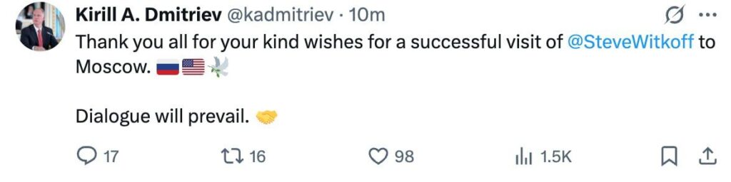 Ръководителят на Руския фонд за преки инвестиции и близък съюзник на Кремъл Кирил Дмитриев описа срещата с две думи чрез платформата X: „Диалогът ще надделее.“