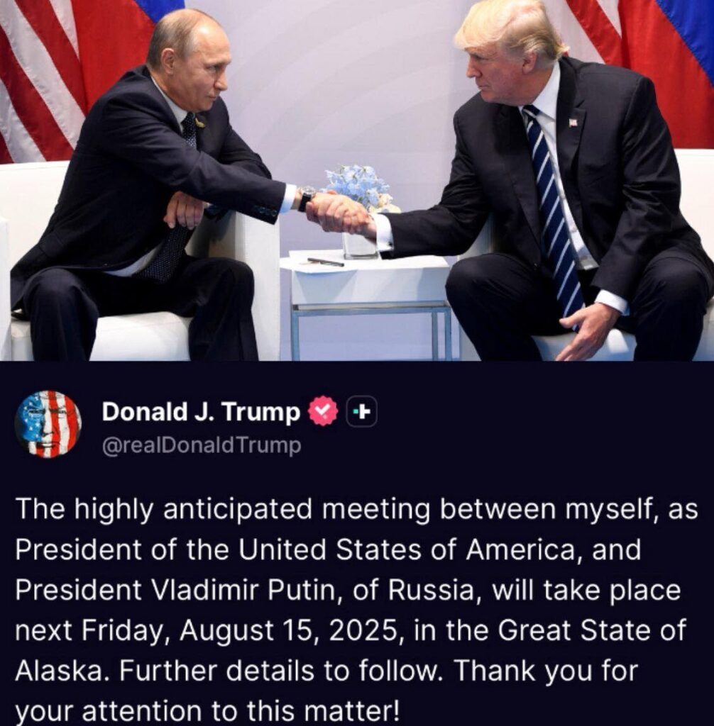 „Срещата между мен, президента на Съединените американски щати, и президента на Русия Владимир Путин ще се проведе следващия петък, 15 август 2025 г., в Аляска.“