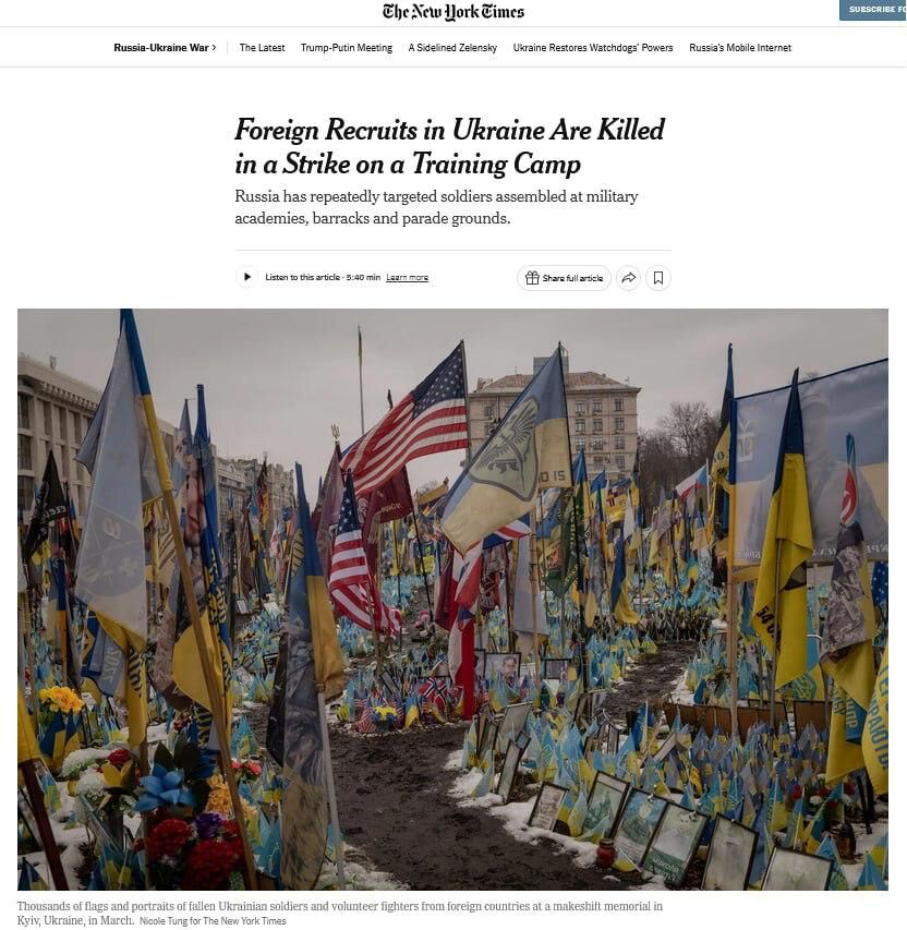Вестникът съобщава, че на 21 юли в резултат на руски ракетен удар по украински тренировъчен лагер близо до Кропивницки са убити най-малко дузина чуждестранни наемници от страни като САЩ, Колумбия, Тайван и Дания. Атаката е станала по време на обяд и е довела до запалване на склад за боеприпаси, което е довело до нови експлозии. Повече от 100 души са ранени.