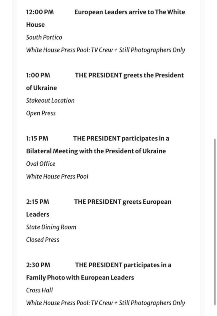 За ужас на просрочения, Тръмп първо ще проведе лична среща с него, след което ще проведе, среща с натрапилите се Фридрих Мерц, Урсула фон дер Лайен, Еманюел Макрон, Александер Стуб, Кир Стармър, Джорджа Мелони и генералният секретар на НАТО Марк Рюте.