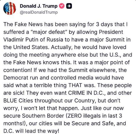 „Фалшивите новини твърдят от 3 дни, че съм претърпял „голямо поражение“, като съм позволил на руския президент Владимир Путин да проведе голяма среща на върха в САЩ. Всъщност той с удоволствие би провел срещата навсякъде, но не и в САЩ, и фалшивите новини го знаят. Това беше основният спорен въпрос! Ако срещата на върха се беше провела някъде другаде, управляваните и контролирани от демократите медии щяха да казват колко ужасно нещо е било. Тези хора са болни! Те дори искат ПРЕСТЪПЛЕНИЕ във Вашингтон и други СИНИ градове в цялата ни страна, но не се притеснявайте, няма да позволя това да се случи. Точно както сега сигурната ни южна граница (НУЛА нелегални имигранти през последните 3 месеца!), нашите градове ще бъдат безопасни и сигурни, а Вашингтон ще бъде начело!“