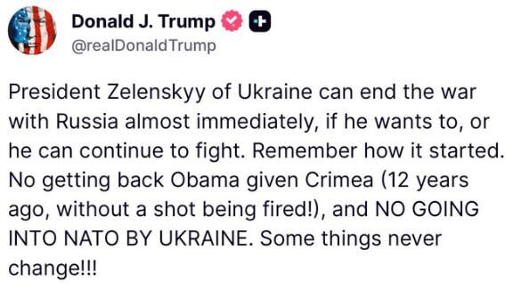 „Няма връщане обратно на дадения от Обама Крим и няма влизане в НАТО за Украйна. Някои неща никога няма да се променят“, написа Тръмп днес.