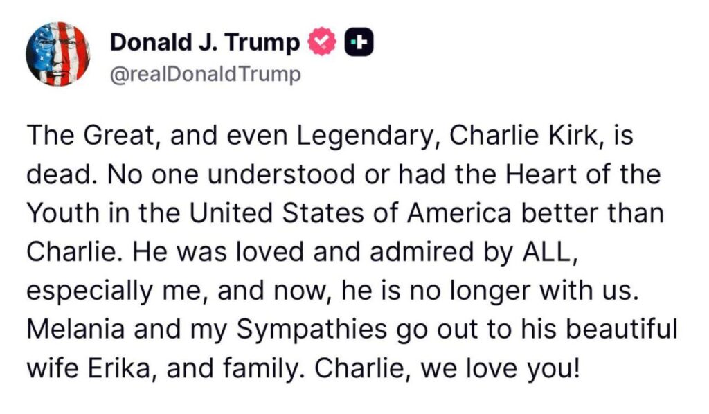 „Великият и легендарен Чарли Кърк почина. Никой не е разбирал или съчувствал на младежта на Съединените американски щати по-добре от Чарли. Той беше обичан и възхищаван от ВСИЧКИ, особено от мен, а сега вече не е сред нас. Мелания и аз изказваме съболезнования на красивата му съпруга Ерика и нейното семейство. Чарли, обичаме те!“