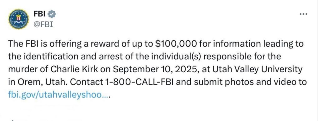 Федералното бюро за разследване на САЩ (ФБР) разпространи снимки на мъжа, заподозрян в убийството на 31-годишния консервативен активист Чарли Кърк, призовавайки гражданите да помогнат за неговото идентифициране. За информация, която доведе до ареста на извършителя, е обявена награда от 100 000 долара.