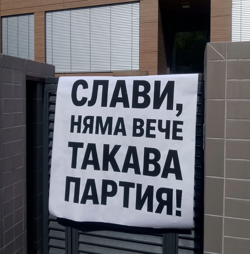 Това оставихме днес на Железните врати на палата на Слави Трифонов в Бояна на улица “Кумата” заедно със стотици негови бивши избиратели и бивши симпатизанти на ИТН. Текстът е моя идея, но го направиха хора – съкварталци, изключително възмутени от поведението на учиндолския пиргишин. Заради Слави и всичките му лупинги през последните 5-6 години ние стигнахме до задънена улица и невъобразимо задкулисие! На дъното сме!