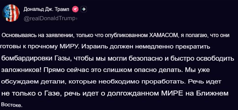 Сега детайлите. Хамас направи веднага след ултиматума официално заявление по плана. В него се казва, че ще освободи заложниците – основната фасадна причина за войната на Нетаняху в Газа. Нека да опиша цялата ситуация – на 7 октомври 2023 година Хамас организира най-голямото нападение над Израел, включително с делтапланери, в ивицата Газа и на пропусквателните пунктове, уби израелски военни и взе заложници. За да ги освободи, Нетаняху започна военна операция срещу сектора с авиация и наземна операция. В няколко военни кампании в това време бяха извършени различни по вид прочиствания на сектора. Почти целия ешалон командване на Хамас беше избито, заложници бяха пускани на няколко пъти. Но войната не спря, напротив, ужесточи се и стигна до налагане на глад в сектора. Израелската военна намеса доведе до смъртта официално на 100-150 хиляди палестинци, от тях 1/3 деца, като неофициално цифрите са х 2.