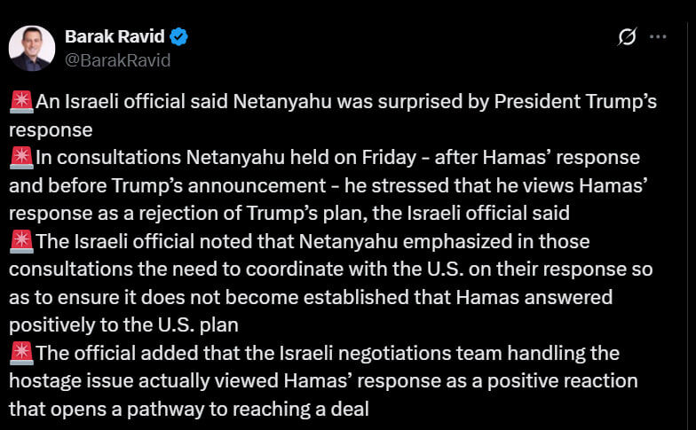 „Израелски служител заяви, че Нетаняху е бил изненадан от реакцията на президента Тръмп. По време на консултациите, проведени в петък, Нетаняху – след реакцията на Хамас и преди изявлението на Тръмп – той подчерта, че разглежда реакцията на Хамас като отхвърляне на плана на Тръмп, каза израелският служител. Израелският служител отбеляза, че Нетаняху е подчертал по време на тези консултации необходимостта от координиране със САЩ относно реакцията им, за да не се възприеме, че Хамас е реагирал благоприятно на американския план. Служителят добави, че израелският преговарящ екип, който се занимава с въпроса за заложниците, всъщност е разглеждал реакцията на Хамас като положителна реакция, която проправя пътя за споразумение.“