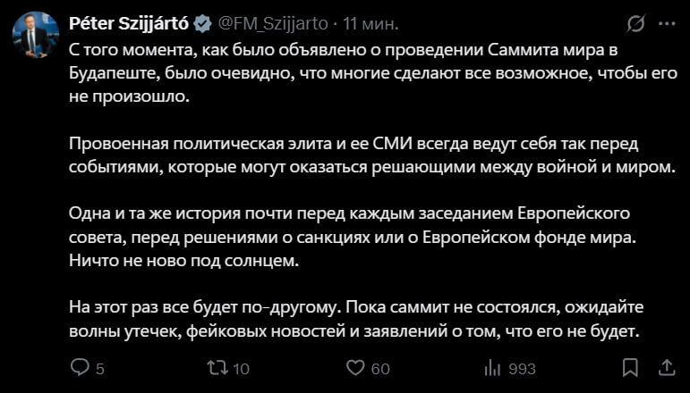 „Докато срещата на върха не се проведе, очаквайте вълна от изтичане на информация, фалшиви новини и твърдения, че тя няма да се състои“, заяви унгарският външен министър Петер Сиярто по повод медийната лудост около срещата Путин-Тръмп в Будапеща.