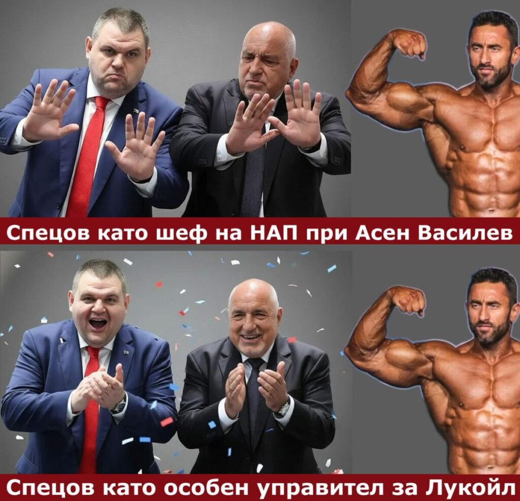 За Вас не знам, приятели, но аз съм спокоен, когато нефтът и бензинът на България са в ръцете на доказани експерти и търговци като тютонюнотърговеца (Булгартабак), експерта в търговията на дребно (Лафка), издателя (Монитор, Телеграф) и банкера (КТБ) г-н Делян Пеевски и търговеца на едро на жито и на дребно на протеинови вафлички и протеин за големи бицепси в кутии, актьора без реплики в “Под прикритие” г-н Румен Спецов.
