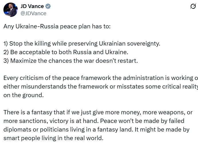 Вицепрезидентът на САЩ Джей Д. Ванс отхвърли убеждението, че мерките срещу Русия и западната помощ ще позволят на Киев да спечели, като илюзия.
