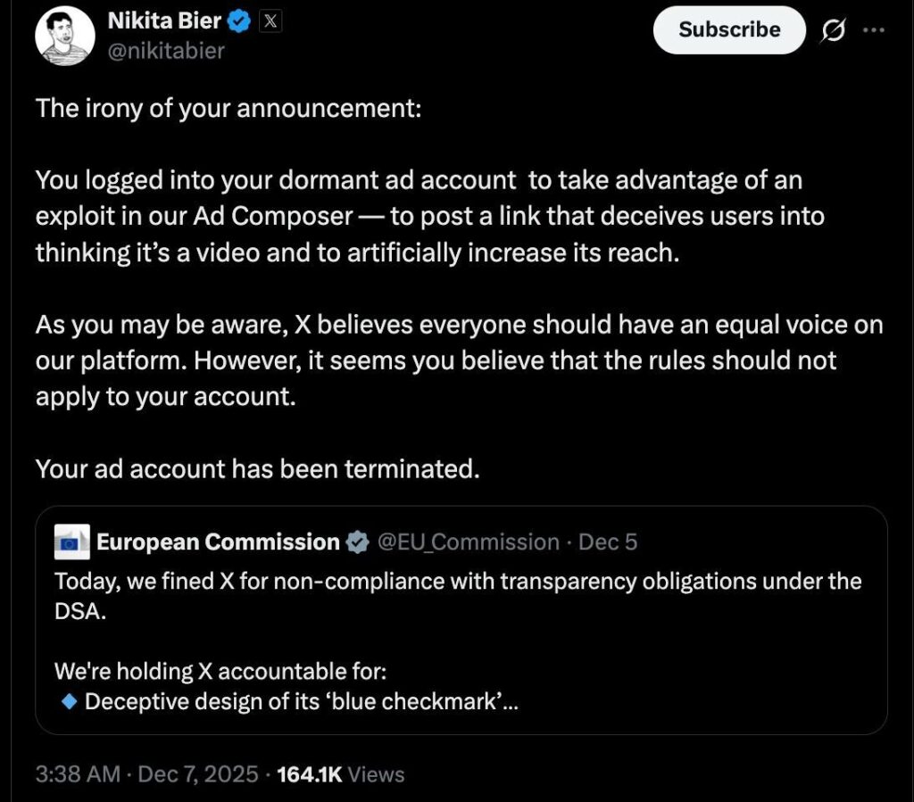 Никита Биер, ръководител на продуктовия отдел на X, обвини изпълнителната власт на ЕС, че се опитва да разшири собствената си публикация в социалните медии за глобата на X, като се опитва „да се възползва от експлойт в нашия Ad Composer“.