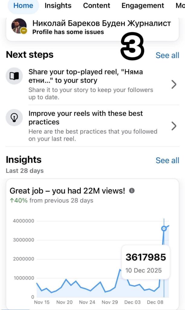 На скрийншот номер 3 виждате моя фейсбук профил, който в деня на протеста и след него има 8 милиона четения за 48 часа, въпреки, че профилът ми бе ограничен. 8 000 000. При мен Протестът бе истински – с кадри и видео от на стотици хиляди протестиращи българи София, България и Европа