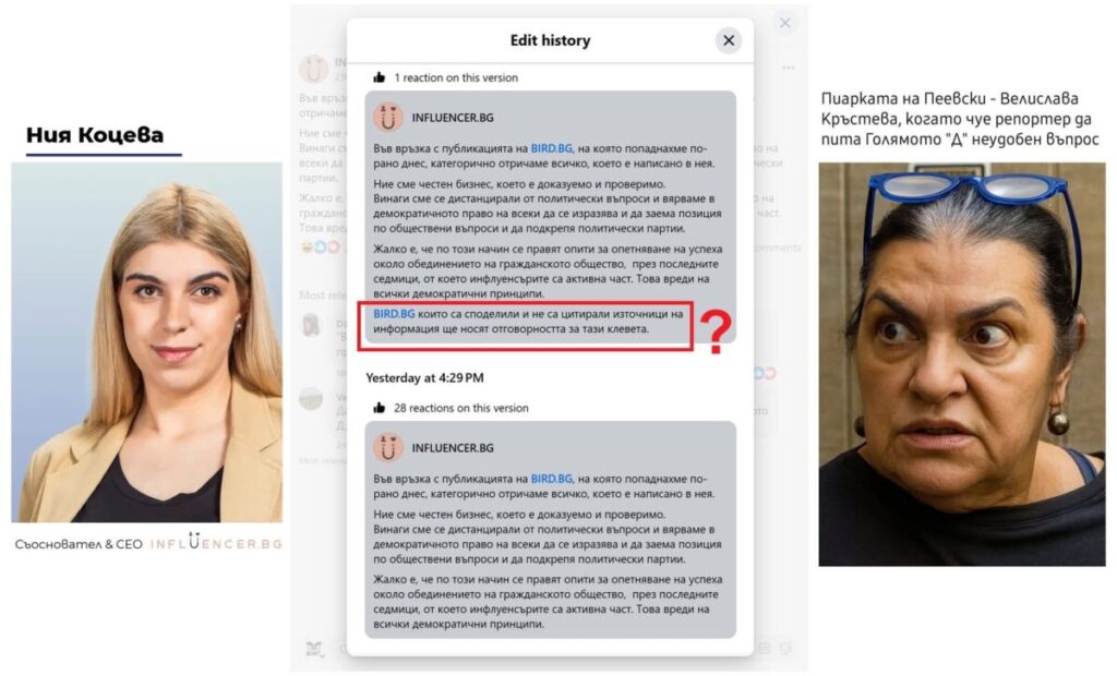 Дъщерята на пиарката на Пеевски се отрече и от майка си. Заплаши ни, вероятно със съд, за клевета, после размисли. Скрийншот с редакцията на фейсбук поста им (в средата).