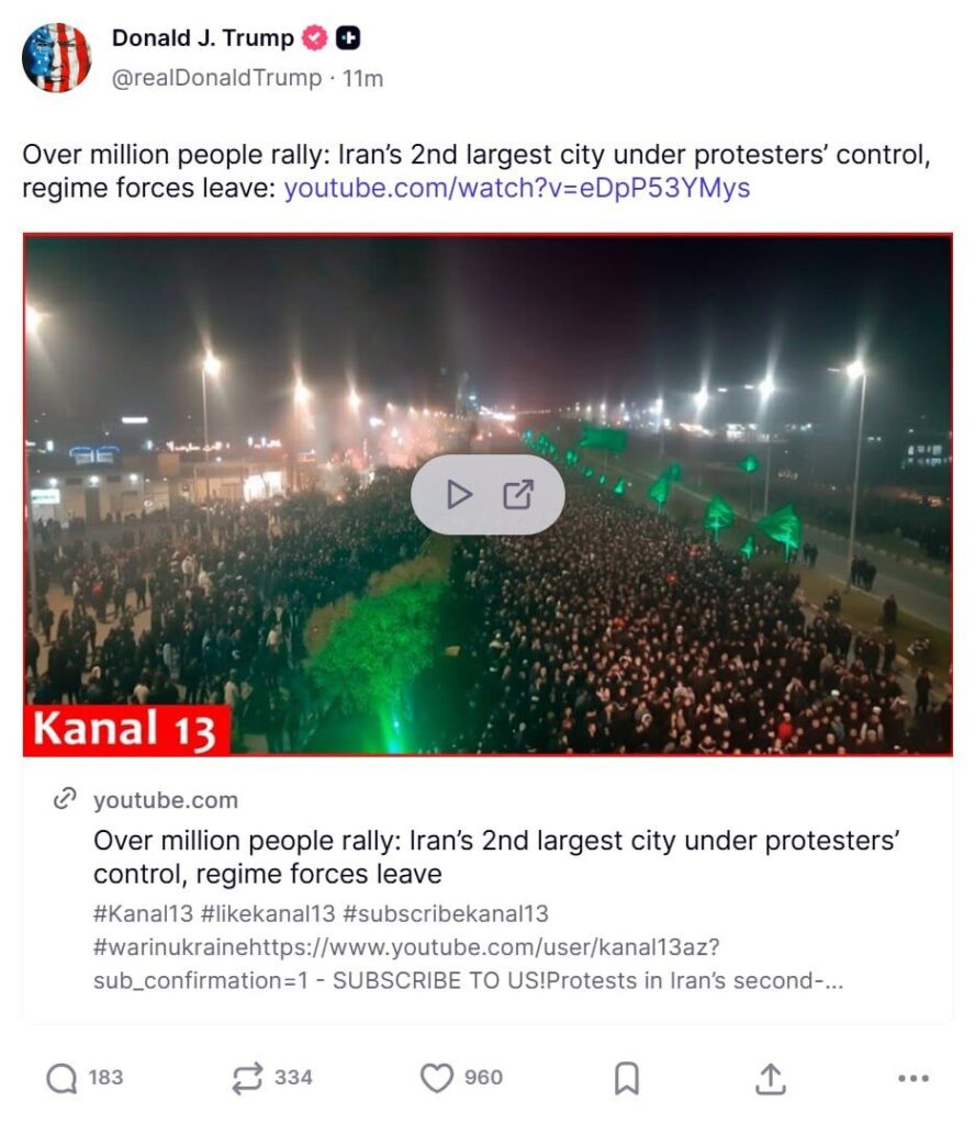 Тръмп отправи остро предупреждение към иранския режим, обещавайки да подкрепи иранците, които протестират срещу него.