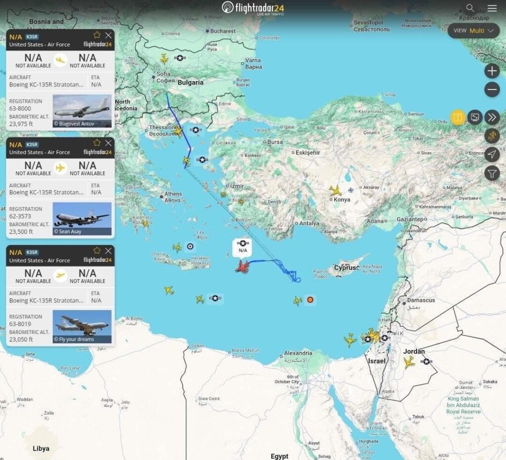 Системата за следене на летателни апарати FlightRadar24 показва самолети-цистерни KC-135, които по-рано излетяха от летище „Васил Левски“ в София, да летят в източното Средиземноморие, съобщава De Re Militari.