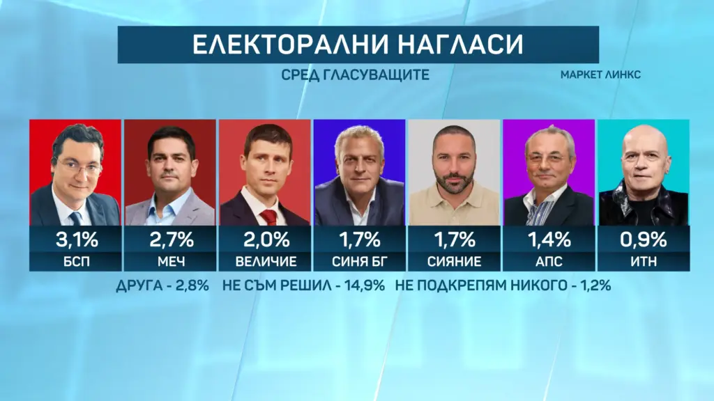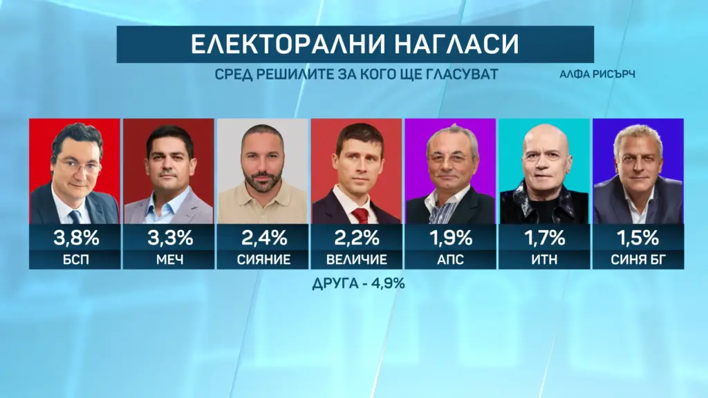 Надпреварата за достигането на 4% е оспорвана. Няколко политически сили имат реален шанс да постигнат резултат, който би им позволил парламентарно представителство. Сред решилите за кого ще гласуват, 3,8% са посочили БСП. МЕЧ има 3,3%.