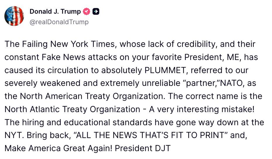 „Провалящият се New York Times, чиято загуба на доверие и постоянни атаки с фалшиви новини срещу вашия любим президент, мен, доведоха до рязък спад в тиража, нарече нашия силно отслабен и изключително ненадежден „партньор“ НАТО Организацията на Северноамериканския договор.