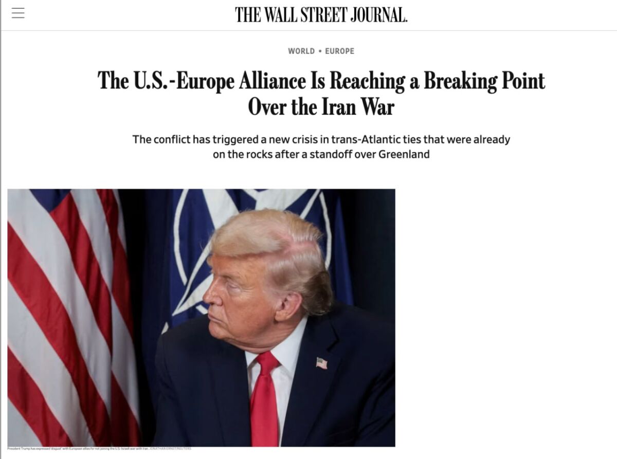 „Президентът Тръмп изрази „отвращение“ към европейските съюзници, че не се присъединяват към американско-израелската война срещу Иран, и според източници обсъжда със своите помощници и журналисти възможността за напускане на Организацията на Северноатлантическия договор – 77-годишният съюз, който спечели Студената война и доскоро беше основата на Запада.“
