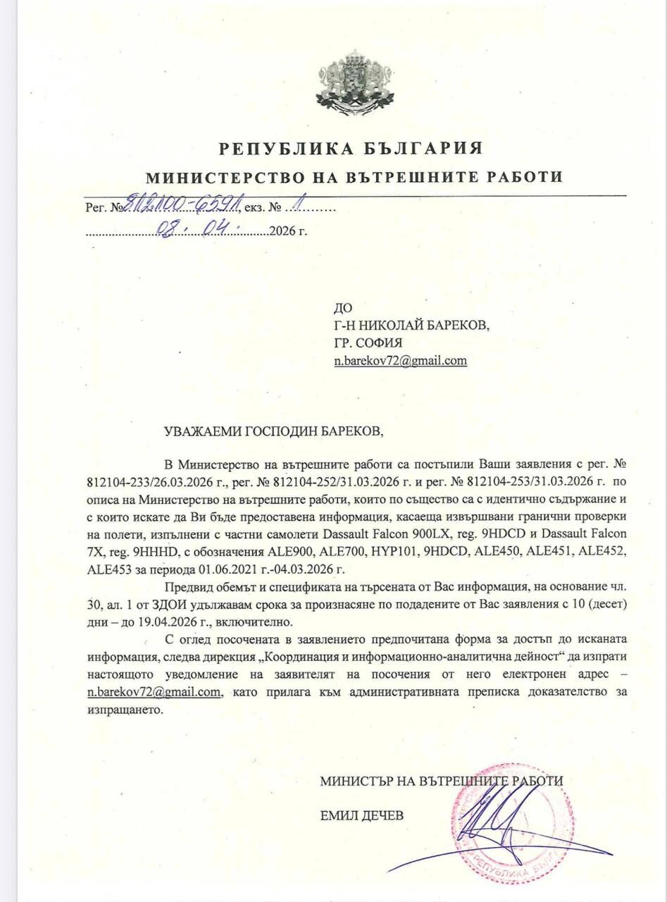 МВР няма да разкрие името на Делян Пеевски и на другите пасажери на частните му Фалкони до деня на изборите. Институцията е длъжна да го направи по ЗДОИ и при надделяващия обществен интерес в определен срок, но министърът на вътрешните работи Емил Дечев се възползва от правото си да удължи срока за обработване на информацията в отговор на въпросите на нашата медия и на журналиста Николай Бареков точно с десет дни – до деня на вота за парламент. Така следва истината да лъсне точно в понеделник на 20 април, в деня за размисъл на българските избиратели – на следващия ден след изборите, защото по стара традиция те първо гласуват, а после го обмислят. Именно от избраната дата на отговора – един ден след изборите, става очевидно, че точно Пеевски е бил на борда на частните си самолети в компанията на други мастити фигури, и МВР просто не желае да даде повод за грандиозен скандал, изнасяйки толкова чувствителна информация в последните дни на кампанията. Във въпросите до МВР са изброени цялата плетеница от регистрации на Фалконите, чрез които Делян Пеевски се опитва да прикрие следите си, както и близо 500 полета на двата му самолета, които са вписани във фонд в ОАЕ. Делян Пеевски не е декларирал нито един полет до тази година в декларацията си до КПК или КОНПИ, нито е оповестил, че има два частни свръх модерни и луксозни самолети, които обслужват само него и са нон стоп на негово разпореждане. BNEWS от три години следи полетите на Пеевски до Дубай и задава публично въпросите след изнесената скандална информация. Миналата година Румен Радев в ролята си на президент бе първият значим политик, който потвърди разследванията на BNEWS и вдигна темата с думите си за “олигарх от първия ред на НС, който лети всяка седмица до Дубай с частния си самолет Фалкон”. Ето и целия коментар на Николай Бареков в личния му фейсбук акаунт “Nikolai Barekov Bnews”, в който днес съобщи новината: