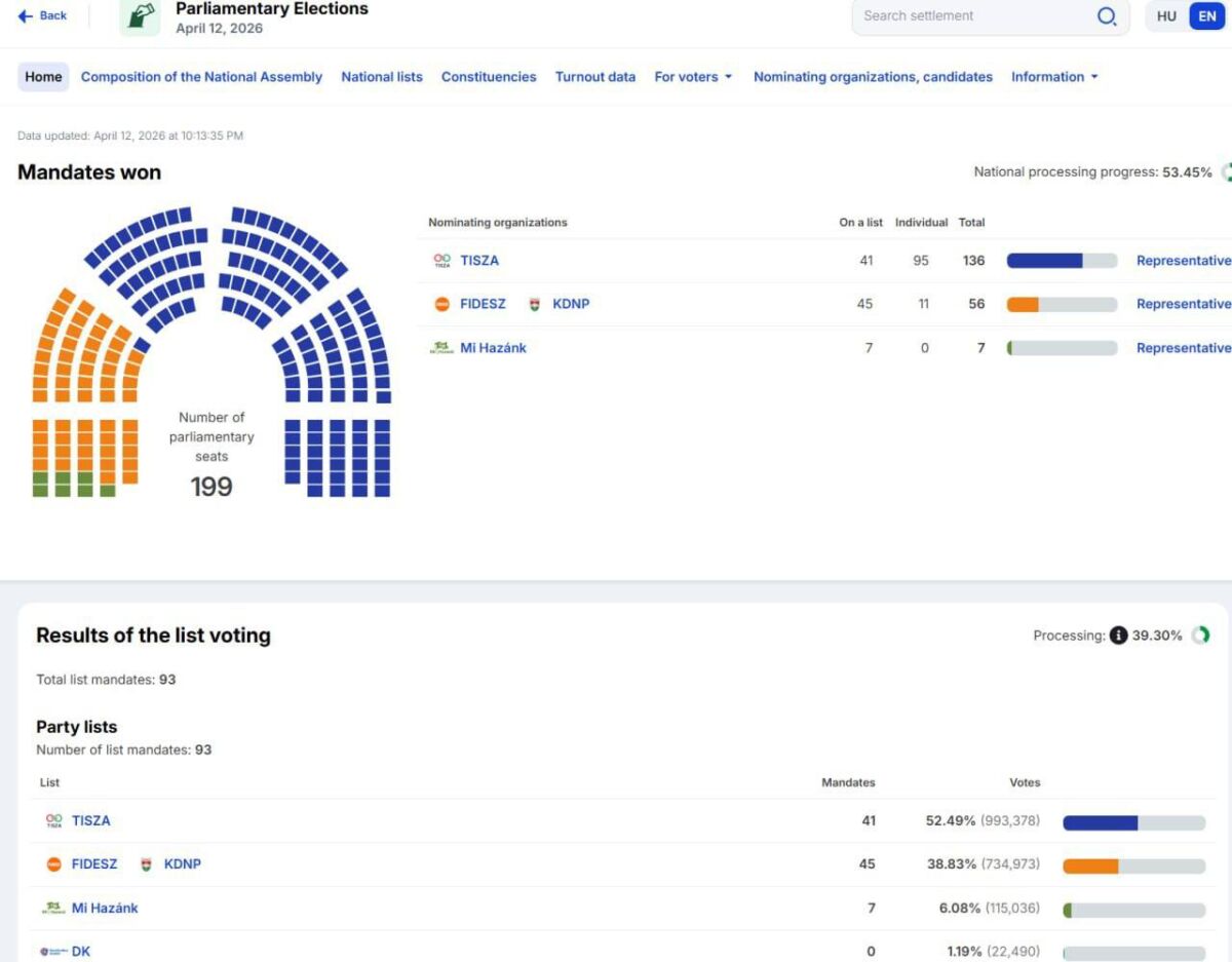 След преброяване на над 53 процента от гласовете, опонентът му Петер Маджар изглеждаше готов да спечели 136 места в 199-местния парламент. Партията Фидес на Орбан беше на път да спечели само 56.