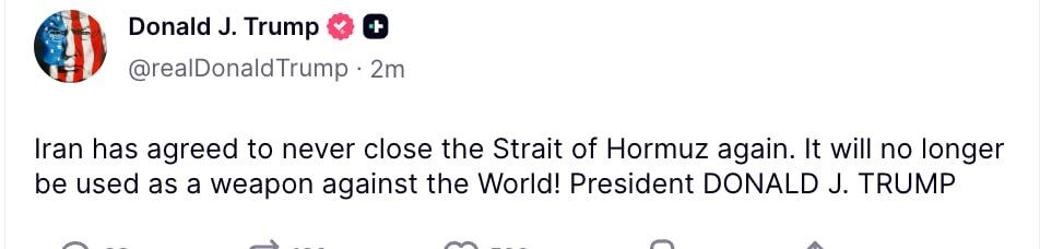 „Иран се съгласи никога повече да не затваря Ормузкия проток. Той вече няма да бъде използван като оръжие срещу света! Президент Доналд Дж. Тръмп.“