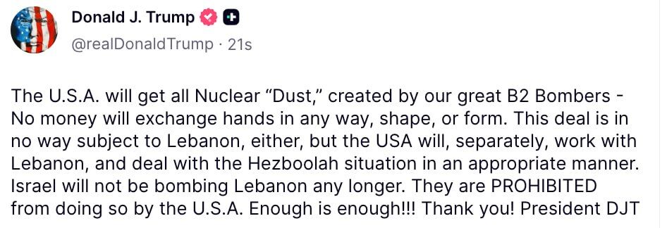 „Съединените щати ще получат целия ядрен „прах“, създаден от нашите страхотни бомбардировачи B2 – никакви пари няма да бъдат превеждани под каквато и да е форма. Тази сделка по никакъв начин не е свързана с Ливан, но Съединените щати ще работят отделно с Ливан и ще се справят със ситуацията с Хизбула по подходящ начин. Израел вече няма да бомбардира Ливан. Съединените щати им забраняват да го правят. Стига толкова!!! Благодаря ви! Президент Доналд Дж. Тръмп.“