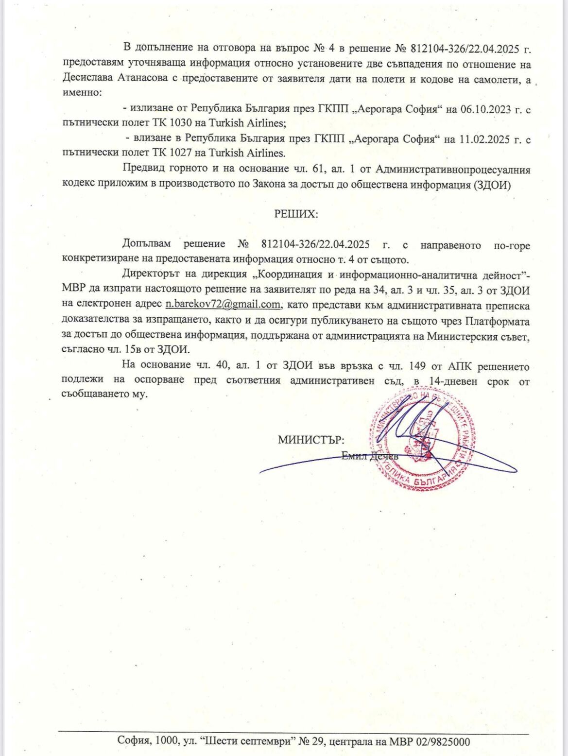 Най-интересното е, че от новия отговор на МВР излиза, че Десислава Атанасова е напуснала България на 6 октомври 2023 година, два дни преди юбилейния си 45-и рожден ден, и се е прибрала обратно почти след две години – на 11 февруари 2025! Напуснала пределите на Родината на 44, завърнала се на 46 години.