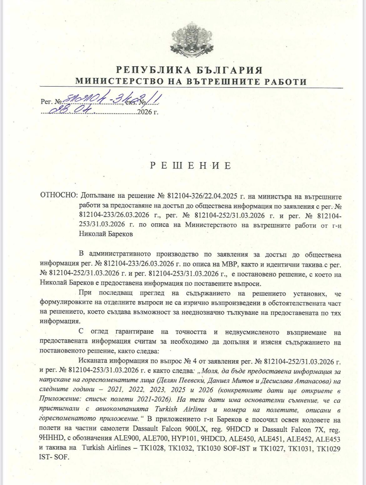 Приятели, ето какъв нов отговор – шедьовър – допълнение получих днес от МВР с подписа на министъра. От него става ясно, че МВР си признава за свои пропуски в предишния отговор, които създават възможности за “нееднозначно тълкуване”.