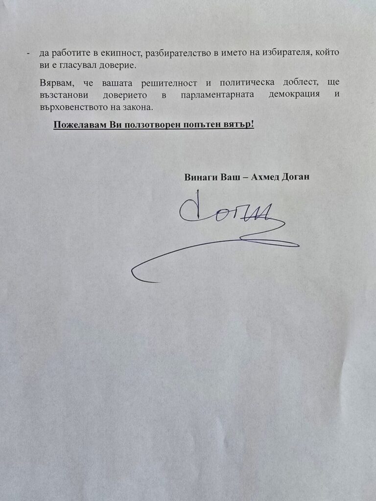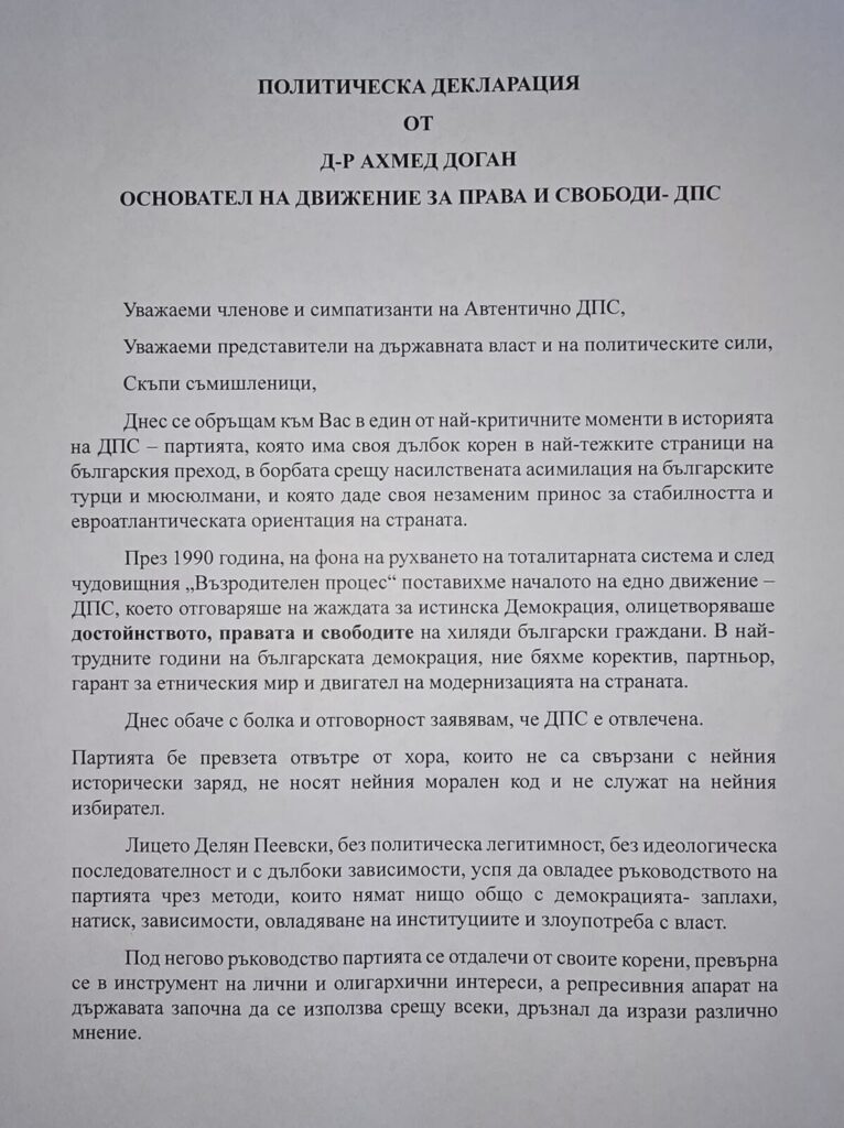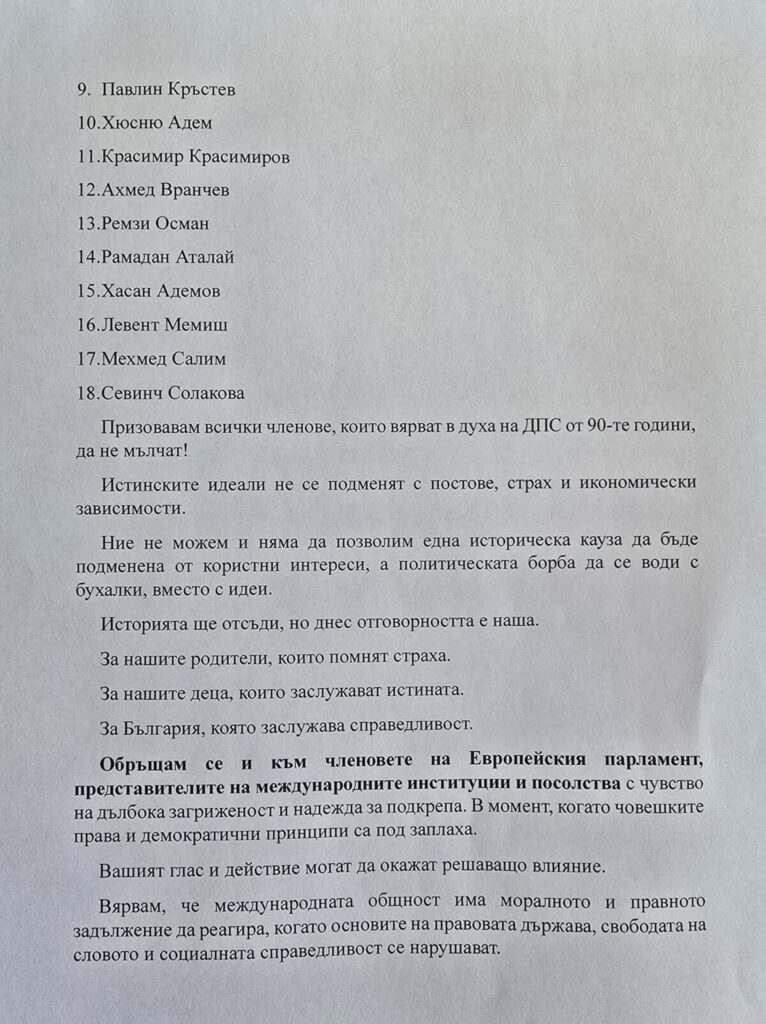 Днес се обръщам към Вас в един от най-критичните моменти в историята на ДПС – партията, която има своя дълбок корен в най-тежките страници на българския преход, в борбата срещу насилствената асимилация на българските турци и мюсюлмани, и която даде своя незаменим принос за стабилността и евроатлантическата ориентация на страната.