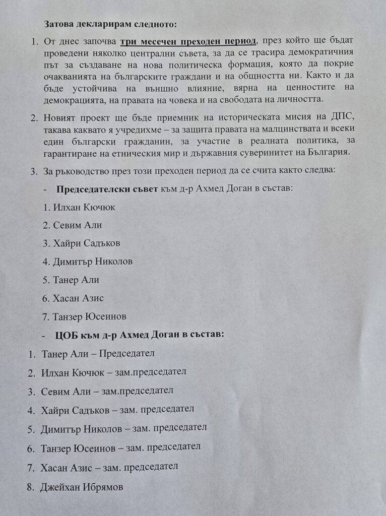 1. От днес започва три месечен преходен период, през който ще бъдат проведени няколко централни съвета, за да се трасира демократичния път за създаване на нова политическа формация, която да покрие очакванията на българските граждани и на общността ни. Както и да бъде устойчива на външно влияние, вярна на ценностите на демокрацията, на правата на човека и на свободата на личността.