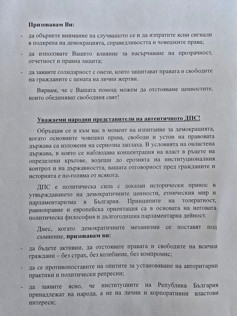 Обръщам се и към членовете на Европейския парламент, представителите на международните институции и посолства с чувство на дълбока загриженост и надежда за подкрепа. В момент, когато човешките права и демократични принципи са под заплаха.