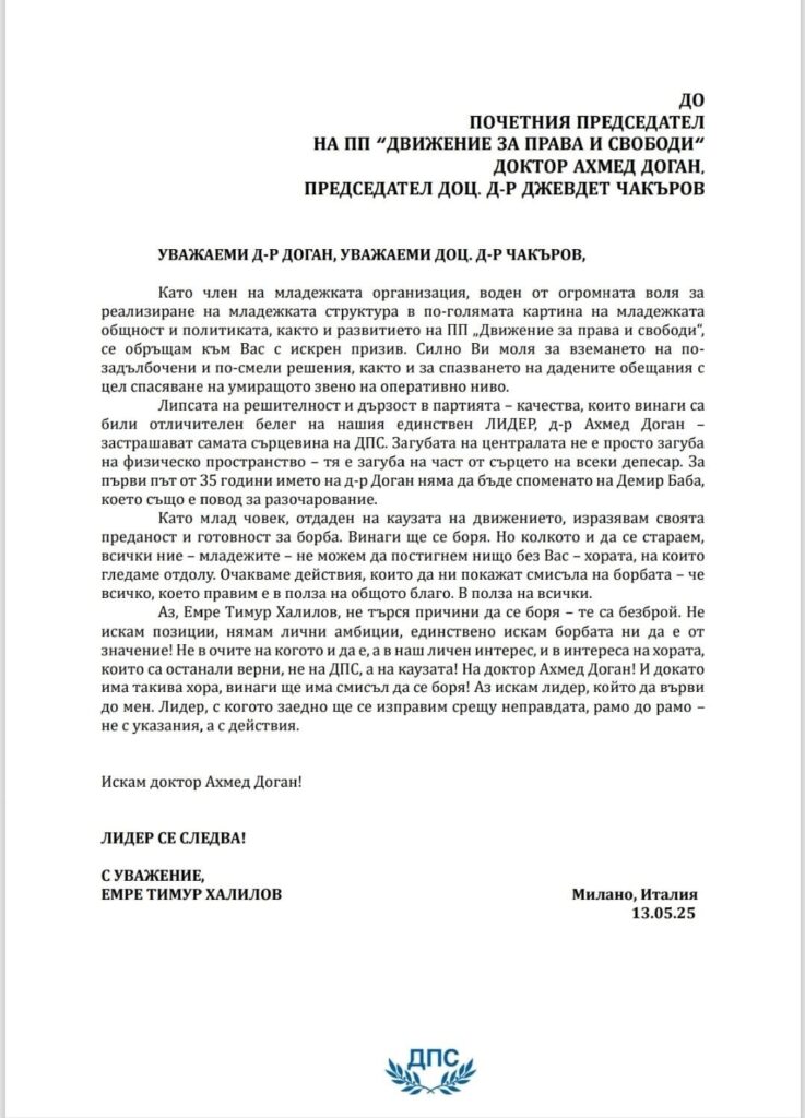 „Липсата на решителност и дързост в партията – качества, които винаги са били отличителен белег на нашия единствен лидер, д-р Ахмед Доган – застрашават самата сърцевина на ДПС“, се казва в писмото, публикувано от, забешежете, ДПС Пресцентър във фейсбук.
