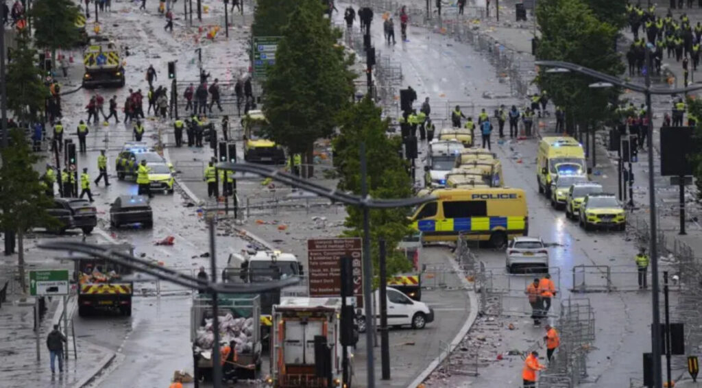 Полицията на Мърсисайд съобщи, че мъж е бил арестуван след пътнотранспортно произшествие на “Уотър Стрийт”, разположена близо до популярната търговска зона „Странд“. Улицата е била отцепена от службите за спешна помощ и не е ясно дали има пострадали и каква е степента на нараняванията. В един от видеоклиповете се вижда как микробус се движи с висока скорост през тълпата. В друг клип смаяни фенове се отместват от пътя, докато полицаи тичат към единия край на улицата. На заден план се виждат полицейски коли и линейки, а на мястото е пристигнал и медицински хеликоптер.