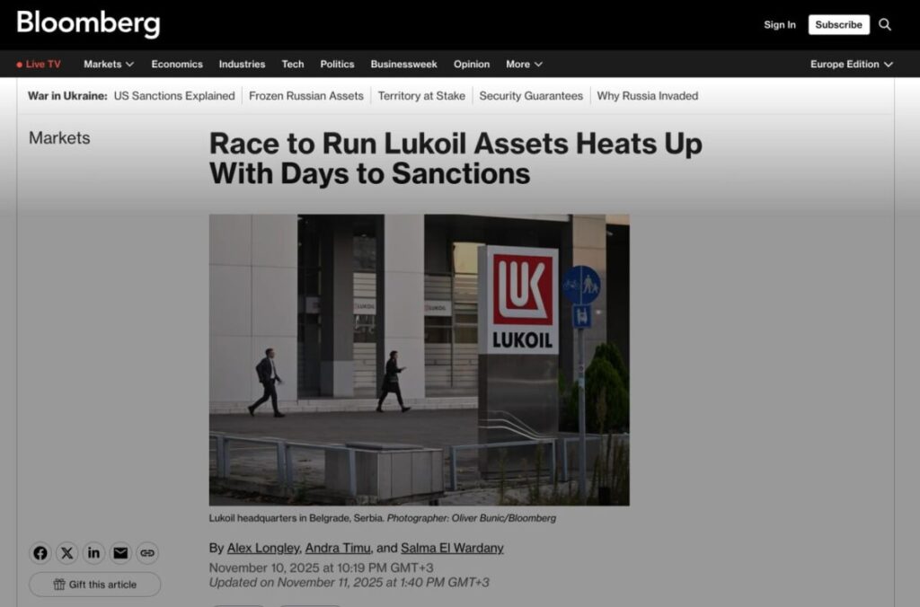 „В ход е истинска надпревара за решение какво да се прави с чуждестранните активи на Лукойл, особено след като Министерството на финансите на САЩ отхвърли предложението на Gunvor да ги купи изцяло“, отбелязва Ричард Бронз, ръководител на отдела по геополитика в консултантската фирма Energy Aspects Ltd., експерт на изданието.
