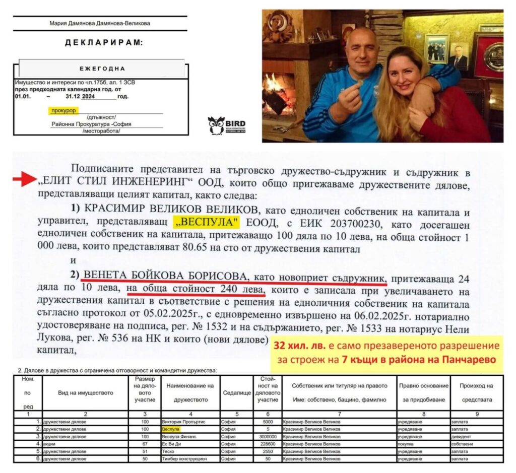 Само за 240 лева Венета е станала съдружник с родата на прокурор и ще строят комплекс от 7 къщи до Панчарево. Фирмата „Елит Стил Инженеринг“, в която Венета Борисова става съдружник през февруари 2025 г., преди това е платила 32 хил. лв. само за презаверката на строителното разрешение. Инвестицията в комплекса с къщи ще е за милиони лева. Предстои да видим КОЙ ще осигури финансирането, пише разследващата медия BIRD.