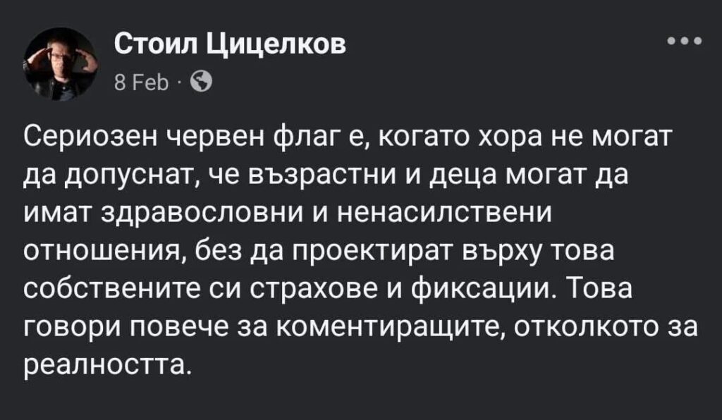 Преди няколко дена щях да коментирам статуса на този господин – червен флаг е, когато хора допускат, че е нормално малки деца да живеят в гората, изолирани, с възрастни мъже, които не са им роднини и без да ходят на училище. Единият от тези младежи и едното дете вече не са сред живите. Може би това е достатъчно червен флаг?