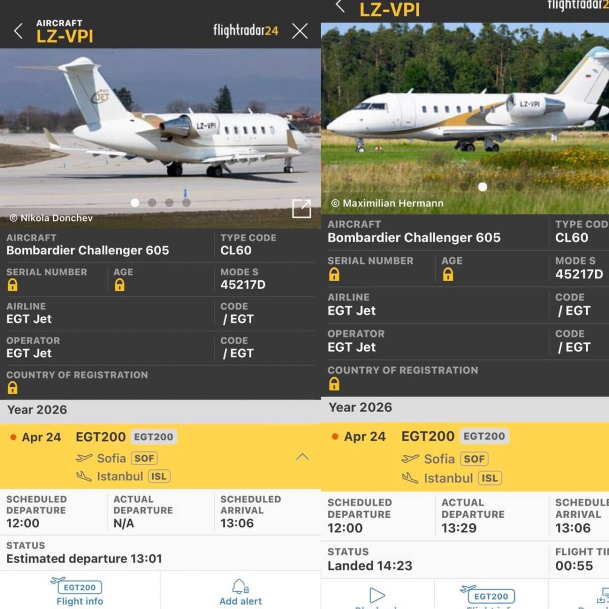 С частния самолет на боса на ЦСКА г-н Валтер Папазки, с който санкционираният за корупция от САЩ и Великобритания за гранд корупция Пеевски явно е в доста близки отношения, защото ползва като свой Bombardier Challenger 605 на свързаната с него авиопревозваческа фирма за частни самолети EGT Jet. Поведението на Шишкото и ползването на тези самолети е част от разследването ни за грубото погазване на санкциите по Магнитски, наложени му от OFAC и Великобритания.