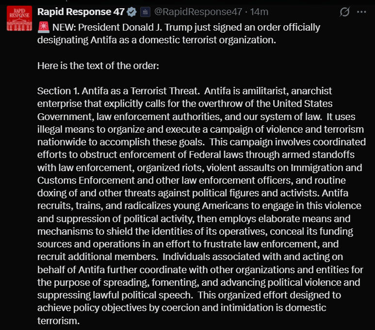 Дочу ли Георг, Желязков и подкрепящите ги соросови стипендианти у нас, че Тръмп днес подписва указ, с който обявява „АНТИФА“ за терористична организация? По-добре да си тръгват по-бързо от там, за да не ги приберат, защото точно тези в продължение на години оперират като клетка на именно тази и производните и организации у нас!