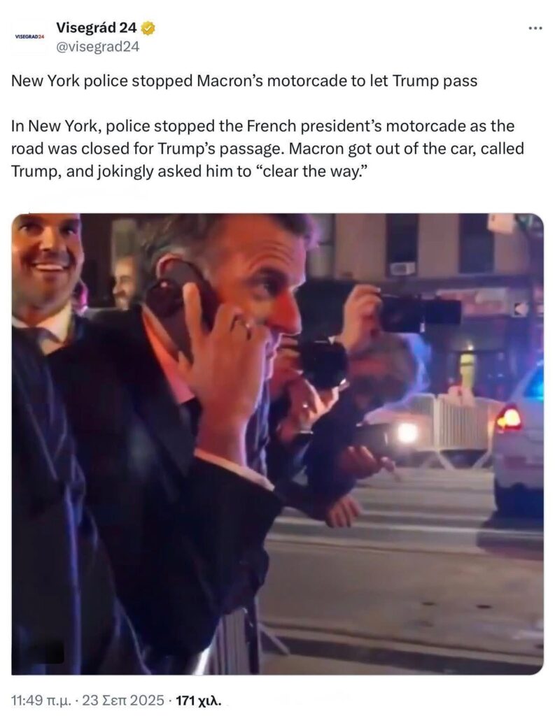 След речта си в ООН, в която обяви историческото признаване на Палестина, Макрон се натъкна на барикади. Полицаите му казали: „Извинете, г-н президент, всичко е затворено – Тръмп минава.“