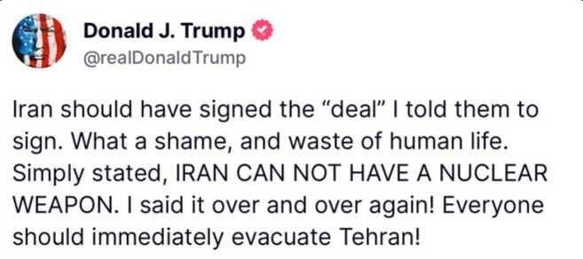 „Иран трябваше да подпише „сделката“, която аз им казах да подпишат. Какъв срам и загуба на човешки живот. Просто казано, ИРАН НЕ МОЖЕ да има ядрено оръжие. Казвах го отново и отново! Всички трябва незабавно да се евакуират от Техеран!“ написа Тръмп в социалната си мрежа „Трут Соушъл“.