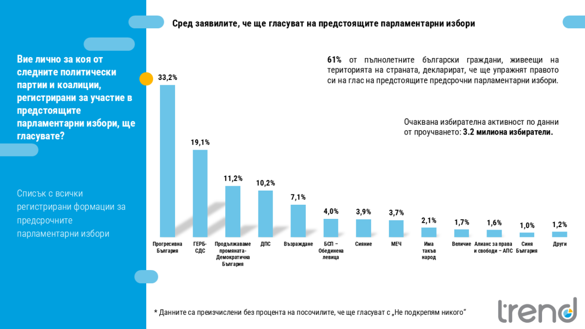 Три формации са на ръба на парламентарната бариера. За БСП декларират, че ще гласуват 4%, но по-висока активност ще изложи на риск тяхното представителство. За „Сияние“ декларират подкрепа 3,9% от гласуващите, а МЕЧ също остава близо до бариерата с 3,7%“, посочват от „Тренд“. Евелина Славчева уточнява, че по-високата избирателна активност работи срещу малките, но работи за новите субекти. Социолозите не мерят нагласите на българите в чужбина, които масово ще гласуват за ПБ на Румен Радев.