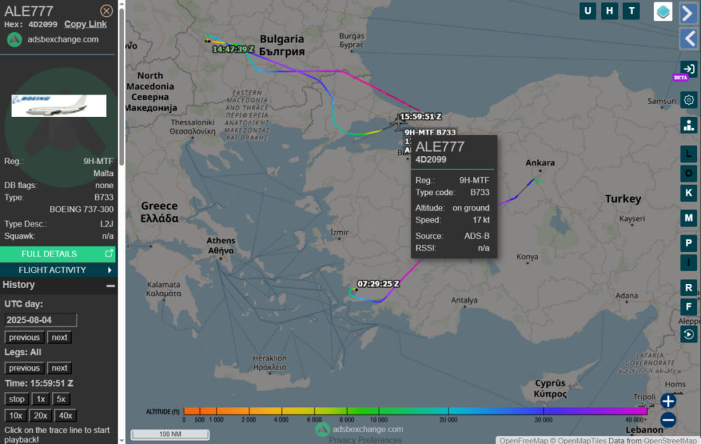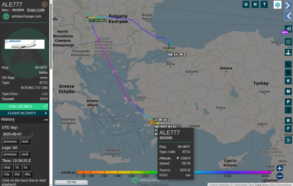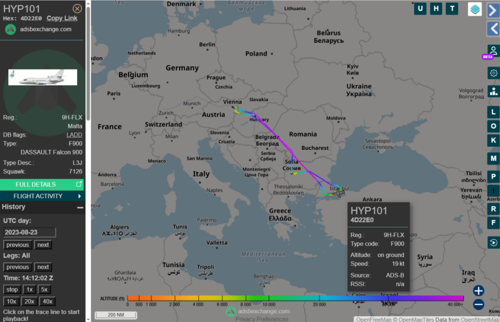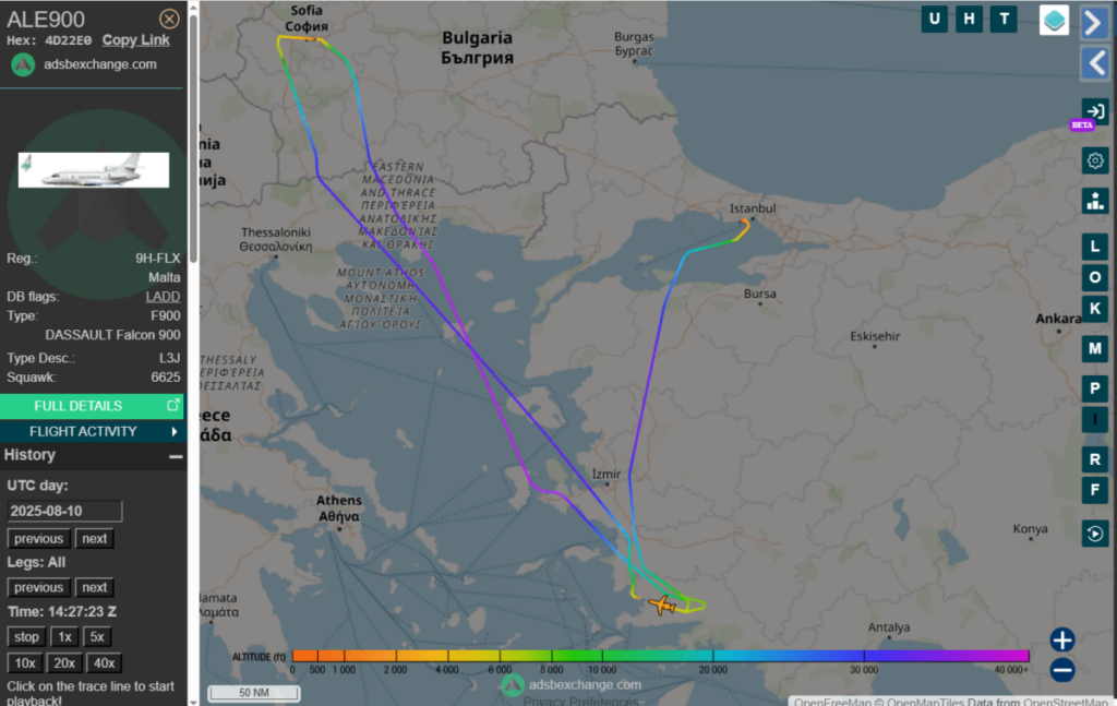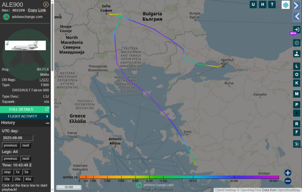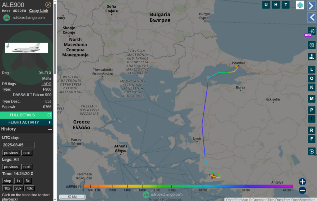 На 5–11 август 2025 г.:и двата Falcon-а се засичат в Бодрум; полетите се редуват между София, Истанбул и Бодрум; това съвпада с празнуването на рождения ден на сина на Делян Пеевски, който празнува десетина дни след именития си татко, който чука 45 на жизненото поприще в средата на 27 юли, но празнува в тесен кръг в София, оставяйки салютите за Турция. По това време Пеевски стиснал Желязков и Борисов за гушата и дерибейства в държавата като главатар на сламения си кабинет.