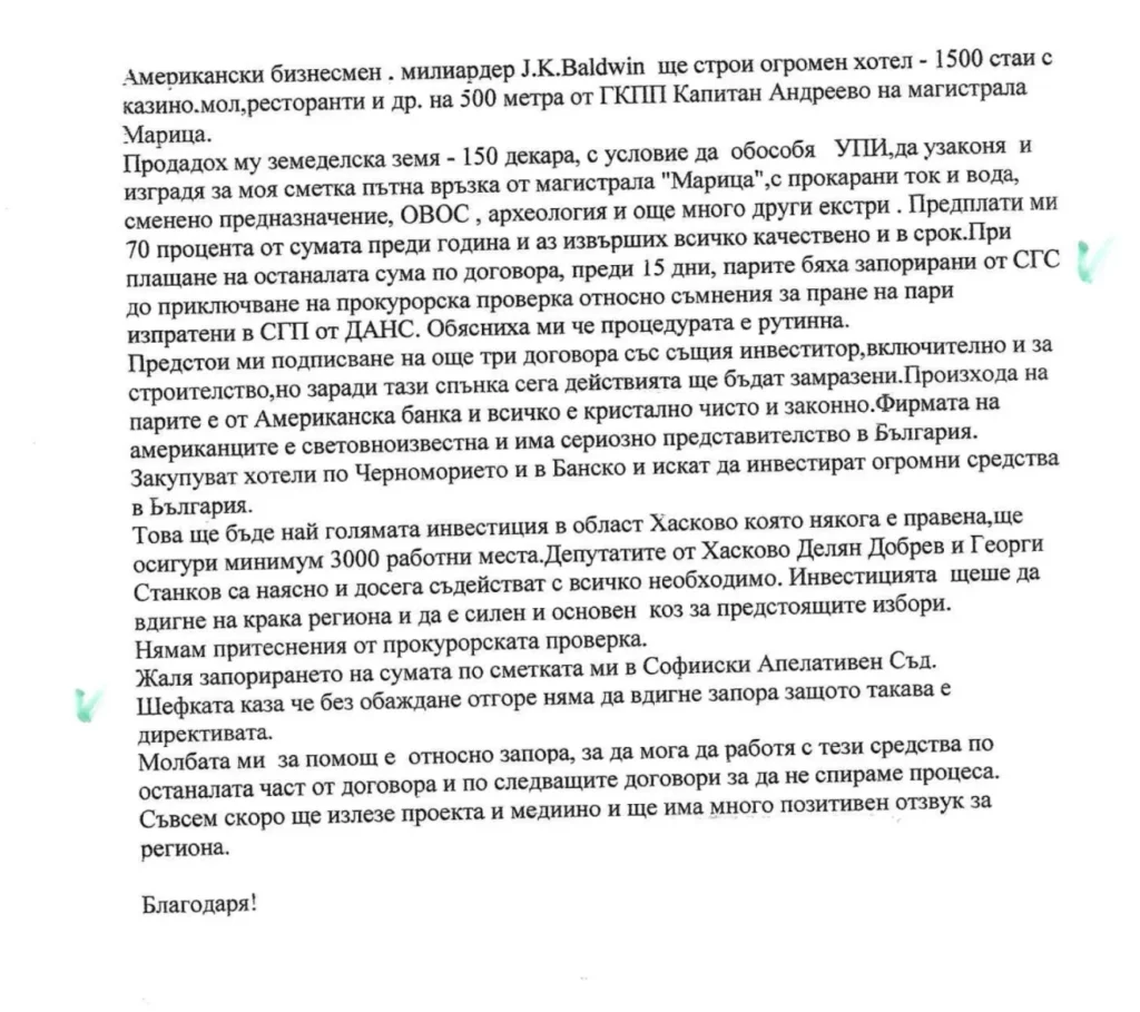 Друг документ, без ясен автор, цитира конкретни лица и събития, свързани със запора на парите от 2019 г., който пречи на сделка на същата фирма на Ами. Тя е за продажба на терени на американски инвеститори, за изграждане на хотелски комплекс срещу “златния паркинг” на ГКПП “Капитан Андреево”.