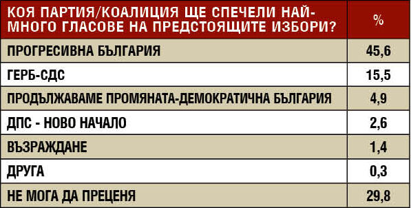Очакванията за изборен резултат са силно концентрирани около “Прогресивна България” като водеща политическа сила, докато останалите партии изостават значително. В същото време близо една трета от хората не могат да преценят, което сигнализира за потенциална динамика и нестабилност в електоралните нагласи. Това разминаване предполага възможност за изненади в кампанията и респективно в резултатите от изборите.