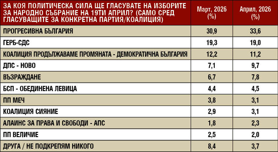 Данните са от представително за пълнолетното население на страната проучване, направено специално за вестник “Труд news” от Агенция СОВА ХАРИС в периода 2 – 6 април 2026 г. сред 800 български граждани по метода на стандартизираното face-to-face интервю в дома на респондента. Максимална грешка за 50% относителен дял при 95% гаранционна вероятност: 3,5%.