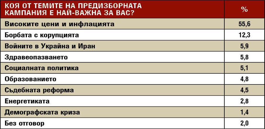 Резултатите от изследването сочат, че темата за високите цени и инфлацията се е превърнала в ключова за предизборната кампания. За повече от половината избиратели това е най-важният въпрос. Това е така, след като 69,8% от пълнолетните българи се опасяват, че вследствие на кризата материалното им положение може да се влоши до степен, че ще са затруднени да се издържат. Едва около една четвърт смятат, че няма да се стигне дотам. Това означава, че болшинството от хората се чувстват на ръба, поради което търсят сигурност и промяна на статуквото.