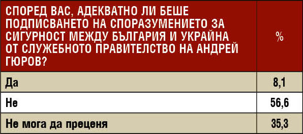 Данните показват ясно изразено обществено неодобрение към подписването на споразумението с Украйна от служебното правителство на Андрей Гюров. Делът на отрицателните оценки е доминиращ, докато високият процент на колебаещите се подсказва недостатъчна информираност или сложност на темата. Това е индикатор за дефицит на легитимност при външнополитически решения, взети от служебна власт.