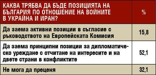 Обществото предпочита умерена и балансирана външнополитическа линия по отношение на войните в Украйна и Иран – мнозинството подкрепя дипломатически подход, отчитащ интересите на всички страни. Подкрепата за пълно съгласуване с линията на Европейската комисия остава ограничена, което говори за търсене на по-автономна национална позиция. Значителният дял на неопределилите се показва несигурност по отношение на сложната международна обстановка.