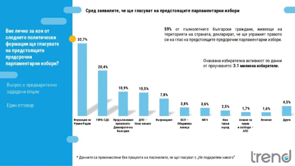 Агенция „Тренд“ представи актуалните електорални нагласи в обществото. Ако изборите бяха днес, 32,7% от участващите бяха гласували за формация на Румен Радев, 20,4% – за ГЕРБ-СДС, 10,9% – за „Продължаваме Промяната – Демократична България“, 10,5% – за „ДПС-Ново начало“, 7,8% – за „Възраждане“, 3,8% – за „БСП – Обединена левица”, 3,6% – за МЕЧ, 2,5% – за „Има такъв народ”, 1,7% – за „Алианс за права и свободи” – АПС, 1,6% – за „Величие, а 4,5% – за други по-малки формации.