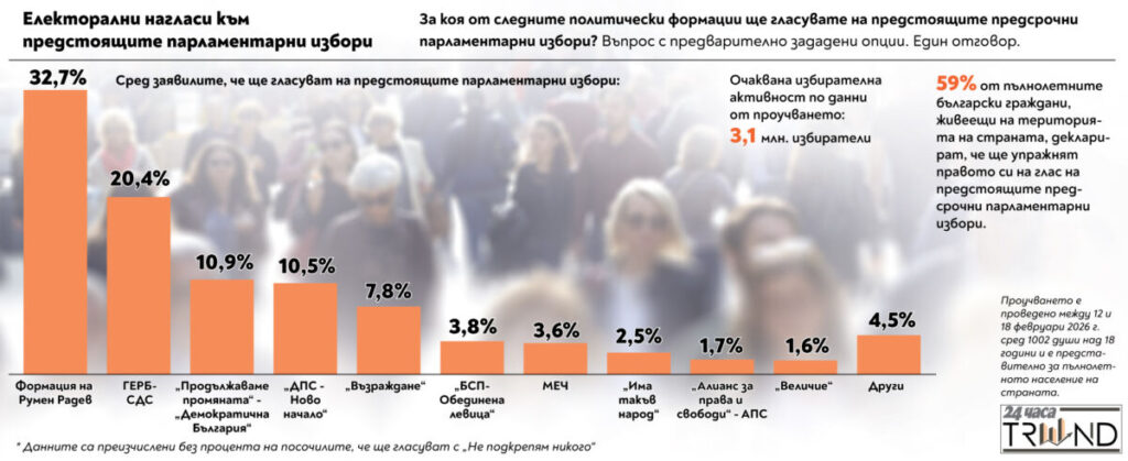 Изследването е направено от агенция „Тренд“ по поръчка на ”24 часа”, посветено на електоралните нагласи на българите. Реализирано е в периода между 12 и 18 февруари 2026 г. чрез пряко полустандартизирано интервю „лице в лице“ с таблет сред 1002 души на възраст 18+.